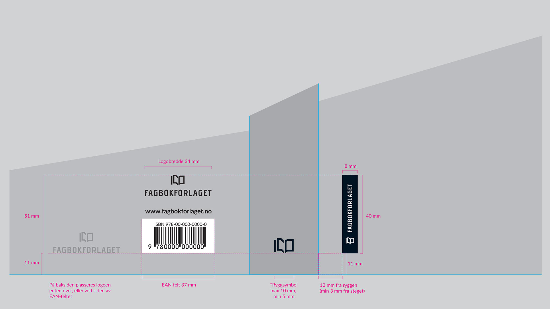 På baksiden plasseres logoen enten over eller ved siden av EAN-feltet. Nettadressen «www.fagbokforlaget.no» har en fast plassering over EAN-feltet. Når logoen skal stå til venstre for EAN-feltet kan den plasseres fritt horisontalt, gjerne sentrert eller venstrestilt i satsspeilet. Det vertikale oppsettet med logo, nettadresse og EAN-felt foreligger som ferdige filer i de ulike fargene.