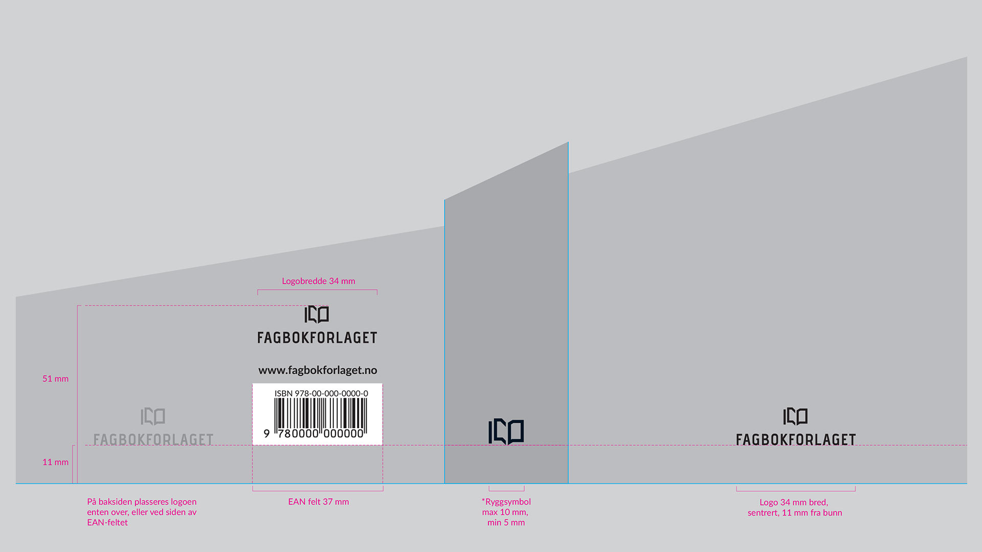 På baksiden plasseres logoen enten over eller ved siden av EAN-feltet. Nettadressen «www.fagbokforlaget.no» har en fast plassering over EAN-feltet. Når logoen skal stå til venstre for EAN-feltet kan den plasseres fritt horisontalt, gjerne sentrert eller venstrestilt i satsspeilet. Det vertikale oppsettet med logo, nettadresse og EAN-felt foreligger som ferdige filer i de ulike fargene.